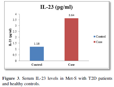 The increased level of pro-inflammatory cytokines suggests that innate immune system also plays a crucial role in the pathogenesis of type 2 diabetes. So, it might be indicating that the IL-17 related cytokines may also be involved in the pathogenesis of type 2 diabetes. Furthermore, the level of IL-23 was found to be significantly increased in Met-S with type 2 DM patients of age groups as compared to healthy controls (p<0.001) (Table 1 and Figure 6). Statistical analysis showed a significant difference between serum levels of IL-6, IL-17 and IL-in metabolic syndrome patients with type 2 diabetes and healthy controls (𝑃<0.001) (Tables 1 and 2 and Figures 4-12).