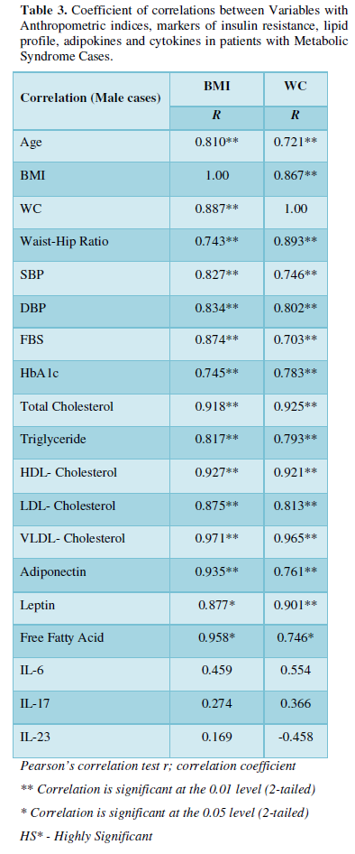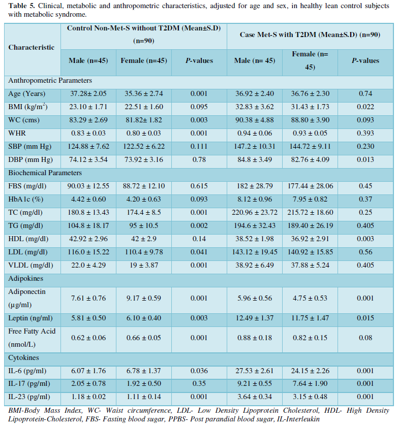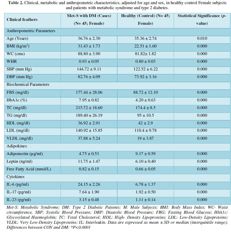 Methods: This case control study investigated 90 cases with Met-S diagnosed by IDF criteria and on-set of type 2 DM (male aged 36.92 ± 2.40 years); (female aged 36.76 ± 2.30 years) comprising 90 healthy control (male aged 37.28 ± 2.05 years); (female aged 35.36 ± 2.74 years) respectively. We compared the circulating levels of the serum cytokines IL-6, IL-23, IL-17 inflammatory biomarker and adipokines levels were investigated using by the ELISA method in Met-S with onset of Type 2 DM with all clinical settings.