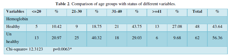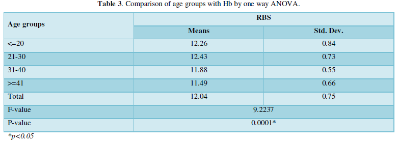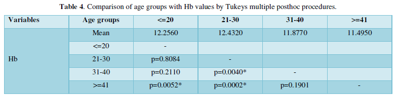 The largest group of the 110 participants ranged from 31-40 years of age. The typical range of hemoglobin for Indian scenario is between 12-14g / dL. 56% of women had levels of Hb well below 12g / dL and 44% of women had levels of Hb that were common. Highest prevalence was observed among the anemic women in the 21-30-year age group. Therefore, the peak reproductive community has been more affected. The findings obtained were therefore statistically relevant evaluated by several posthoc procedures by ANNOVA & Turkey’s in one way.