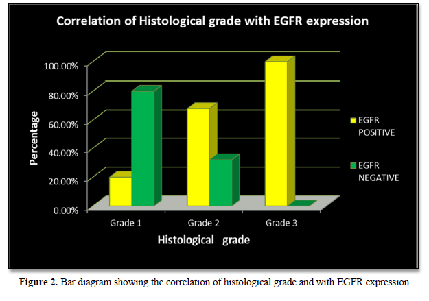 EGFR expression was significantly correlated with increasing histological grades of TNBC in the present study. The p value was 0.006 which was in concordance with the studies by Abdelrahman [15], Changavi [11] and Zhang [10] who also observed a statistically significant correlation with P values of 0.006, 0.034 and 0.005. Fox [23] showed a statistically insignificant result (P = 0.085).