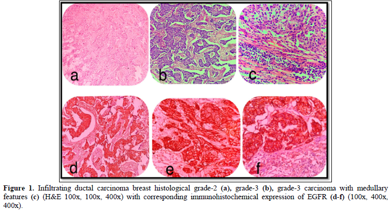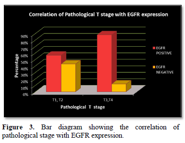 EGFR expression was observed in 28 (70%) cases with a score of 2+ in 10 (25%) cases and a score of 3+ in 18 (45%) cases, while it was negative in 12 (30%) cases which included score 0 (6 cases- 15%) and score 1 (6 cases- 15%). EGFR expression was highest in Grade 3 tumors (Figure 2) in age group >50 years and in those belonging to the histological type carcinoma with medullary features. (Figures 1d-1f) The highest frequency of EGFR positive cases belonged to the stage T3, T4 (Figure 3). It was also noted that expression was slightly higher in cases that showed negative nodes. All the cases which had LVI and PNI showed positive EGFR expression although results were not statistically significant (Table 2).