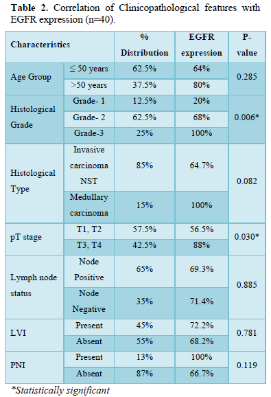 Methods: In the present prospective study, 40 histologically confirmed cases of TNBCs during the period of May 2018 to July 2020 were included in the study. The cases were subjected to EGFR immunostaining and its expression was evaluated and correlated with the various clinico-pathological parameters. Obtained results were analyzed using Chi- square test (Statistical Package for Social Sciences (SPSS) version 23), value of P
