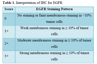IHC profile of the tumor was assessed by submitting one representive section from tumor block to EGFR. IHC was performed on 4 µm thick sections according to streptoavidin-biotin immunoperoxidase technique. The intensity of EGFR expression and percentage were assessed and scored on a scale of 0 to 3+. Only membrane staining (dark golden-brown precipitate) of malignant cells was evaluated and cases with only cytoplasmic staining were considered negative, irrespective of staining intensity (Table 1).