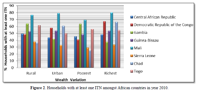 In 2010, 8 countries showed results within the survey analyzed, amongst which Mali had the highest households with ITN irrespective of wealth variable. Apart from Mali all other countries ranged between 26%-68%. Gambia showed above 10% higher households with ITN in rural/poorest than urban/rich areas. Chad had the opposite with higher in rich/urban than poorest/rural areas. Some countries inclusive of Sierra Leone and Central African Republic showed little variation with wealth difference (Figure 2).