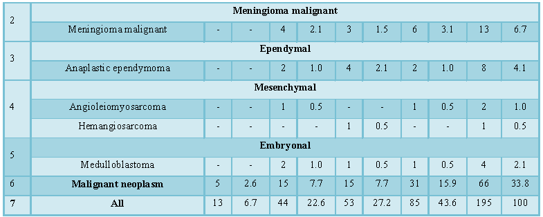 taken by meningioma malignant -13 (6.7%). Mesenchymal malignant, a group of