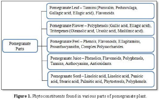 The oil obtained from pomegranate seeds has as of late gotten more regard for be utilized in modern procedure and furthermore in giving essential unsaturated fats. Immersed and unsaturated fats represent the principle extents of unsaturated fats composites [18]. The various bio active pharmaceutical constituents are described in Figure 1 and therapeutic benefits of pomegranate are expressed in Figure 2.