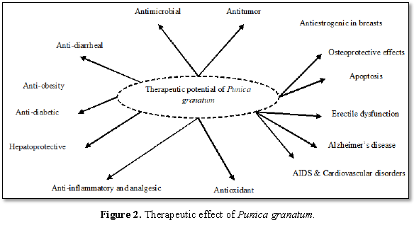 The pharmacological actions of pomegranate have all the earmarks of being wide assortment. In this way, prompting an upgrade ubiquity as a characteristic mixes and useful sustenance since hundreds of years. The pomegranate polyphenols like punicalagin is known to have strong anticancer action in cervical, breast and lung cells. About all the parts of pomegranate are shows biological effects including calming, anticancer, hostile to diabetes, hepato defensive, anti-atherogenic and cancer prevention agent action [19].