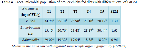 Caecal microbial population of broiler chicks fed diets with different level of GIGM is presented in Table 4. Microbial population of E. coli, Lactobacillus spp and Salmonella spp ranged from 20.12 - 34.98 (log10CFU/g), 15.40 - 30.44 (log10CFU/g) and 18.20 - 29.09 (log10CFU/g). E. coli and Salmonella spp values were highest in T1 relative to other treatments (P˂0.05) contrary to Lactobacillus spp count where T5 was highest, T2, T3, T4 followed similar trend and lowest in T1 (P˂0.05).