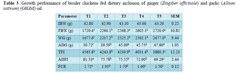 The objective of the present study was to determine effect of dietary inclusion of (Zingier Officinal) and garlic (Allium sativum) oil mixture (GIGM) on the growth performance and caecal microbial population of broiler chickens. One hundred and fifty-one-day-old broiler chicks (Ross 308) were randomly allocated into 5 treatments with three replicates consisting of 10 birds each in a completely randomized design. Birds in treatment 1 (T1) was fed basal diet with 0 % inclusion of GIGM while T2, T3, T4 and T5 were given 0.1 %, 0.2 %, 0.3 % and 0.4 % respectively. Clean feed and water were offered ad libitum and all other management practices were strictly observed throughout the experiment which lasted for 56 days. Results obtained were used to determine weight gain (WG), average daily weight gain (ADWG), total feed intake (TFI), average daily feed intake (ADFI), feed conversion ratio (FCR) and microbial population of E. coli, Salmonella spp and Lactobacillus spp. ADWG, ADFI and FCR were significantly (P ˂ 0.05) influenced by the dietary inclusion of GIGM. ADWG were highest in T5 (47.80 g), T4 (45.75 g) and T3 (45.09 g), intermediate in T2 (39.59 g) and lowest in T1 (30.72 g). Lactobacillus spp increased as the level of dietary inclusion of GIGM increases (P ˂ 0.05). E. coli and Salmonella spp counts were significantly (P ˂ 0.05) different among the treatments. It was concluded that GIGM could be included in the diet of broilers up to 0.4 % without causing any deleterious effect on the performance and health of birds.