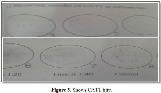 From a total of 200 blood samples there were 37 cases positive (prevalence rate of 18.5%) as seen from the results the T.b. gambiense dried samples on filter papers be tested by CATT. This requires a smaller quantity of reagents than that needed for CATT on serum samples and the cost is therefore reduced the results seem less reliable than for the CATT on serum, but this depends on technique used (Figures 3 and 4).