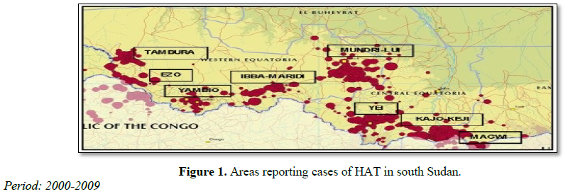 Human African Trypanosomiasis or sleeping sickness has been a public health problem in Sudan throughout most of the 20th century. Endemic foci of T.b. gambiense are found in southern Sudan. The disease in Sudan has been mainly of the Gambian type transmitted mostly by Glossina fuscipes [40]. The latest civil unrest has resulted in a massive resurgence of the disease in the republic of southern Sudan, in the provinces of western and eastern Equatoria. When a bilateral Belgian-Sudanese trypanosomiasis treatment and control programme was implemented. This effort brought the disease under relatively good control within a few years. However trypanosomiasis programme collapsed in 1990 during the Civil war. Sleeping sickness treatment in Southern Sudan remained available at a single site the La Rangu Hospital in Yambio country. As treatment drugs were in limited supply staff members were unpaid and transport to the hospital was not available, there was virtually no active case detection in Southern Sudan for more than 8 years.