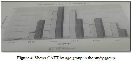 120 blood samples were collected for serological screening and the titre from these 120 samples showed 18 positive samples. The prevalence rate was 15%. The titre (1:10 showed 9.2%), (1:20 showed 3.3%), 1:40 showed 2.5%). All blood stained by Giemsa stain were negative, and dried blood samples on filter paper was done by CATT reagent gave 19 positive samples with the prevalence rate 15.8% respectively this requires a smaller quantity of reagents than that needed for the CATT on serum samples and the cost is therefore reduced the results seem less reliable than for the CATT on serum, but this depends on the technique used. Large scale evaluation is needed to assess the reliability of CATT on dried blood samples in different epidemiological situation. The serial dilution of the blood samples in 120 blood samples there were 19 blood samples (15.8%) (1:10 show 10.0%), (1:20 show 3.3%), 1:40 show 2.5%).