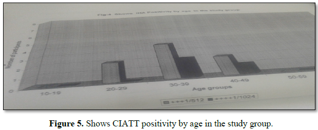 From 200 blood samples 14 positive results were obtained (prevalence rate of (7.0%) as seen from the results there were variations between positive cases detected by CATT and CIATT in displace people in Khartoum state. CATT detected more positive cases than CIATT (20.0%, 14.0% respectively). However parasitological examination did not show the presence of parasites. There was dilution of the reagent 1+7 (1:8) from 1:2, till 1:512 go on titer until 1:4096 is the significant titer before is cu-off (1:512), there were 14 samples (Figure 5 and Table 4).