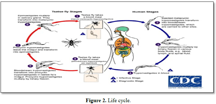 During a blood meal on the mammalian host, an infected tsetse fly (genus Glossina) injects metacyclic trypomastigotes into skin tissue. The parasites enter the lymphatic system and pass into the bloodstream Inside the host, they transform into bloodstream trypomastigotes, are carried to other sites throughout the body, reach other blood fluids (e.g. lymph, spinal fluid) and continue the replication by binary fission, The entire life cycle of African Trypanosomes is represented by extracellular stages. The tsetse fly becomes infected with bloodstream trypomastigotes when taking a blood meal on an infected mammalian host. In the fly’s midgut, the parasites transform into procyclic trypomastigotes, multiply by binary fission, leave the midgut and transform into epimastigotes. The epimastigotes reach the fly’s salivary glands and continue multiplication by binary fission [8]; The cycle in the fly takes approximately 3 weeks. Humans are the main reservoir for Trypanosoma brucei gambiense, but this species can also be found in animals. Wild game animals are the main reservoir of T.b. rhodesiense.