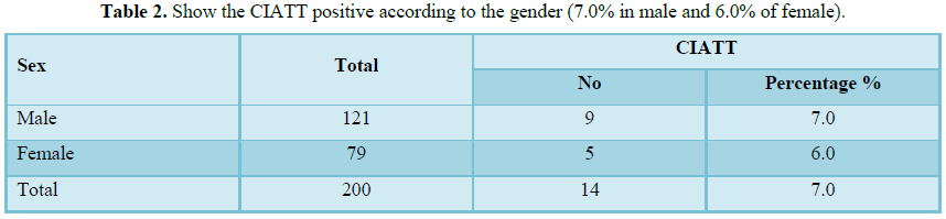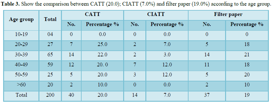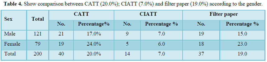 A comparison between CATT and CIATT for diagnosis of sleeping sickness was made on 200 serum samples from displaced people’s camps the result showed 40 positive cases for CATT (20.0%) but only 14 positive cases were detected by CIATT (7.0%) (The intensity of reaction is given in Tables 2 and 3. Similar cross-reaction in positive serum from trypanosomiasis-free areas was examined serologically. 30 patients from Gaderif state with malaria 30 (3.0%) and serum from 30 patients with leishmaniasis from the ward of leishmania from Gaderif state (6.0%), W. bancrofite 200 cases showed (2.5%). 15 cases of toxoplasmosis the prevalence rate -(0.0%) and the last test was hydatidosis 15 positive showed prevalence rate (0.0%) from statistically CATT and CIATT were found similar in the detection of the false positive cases from patients with malaria and leishmaniasis from non-endemic areas, on the other hand we found negative results in Toxoplasma gondii and hydatid disease 0.0%.