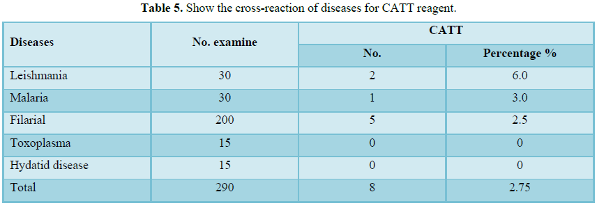 Methods: A population of 200 serum samples from 3 displaced health centre around Khartoum state were examined using different techniques blood films, CATT, CIATT test and PCR on whole blood and similar analysis in their cross reactivity which resulted in the detection of the false positive cases of sleeping sickness from patients with malaria, leishmaniasis, Filarial (W. bancrofite) and negative cases show in Toxoplasma gondii and hydatid disease from non-endemic areas of sleeping sickness.