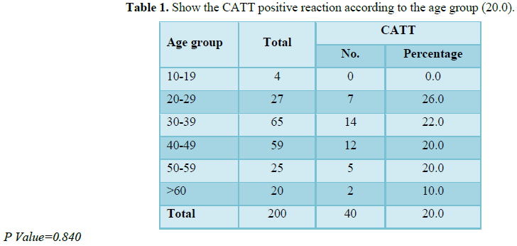 Using CATT on 200 serum samples from the three health centers of displaced people’s camps in Khartoum state, who originated from endemic areas in southern Sudan, showed 40 positive cases (20.0%) and 14 positive cases (7.0%) respectively. However, a microscopic examinations using wet, thick and thin blood film gave negative results in all samples (Table 1). Positive cases were found statistically to be higher in males than females (7.0%, 6.0%, respectively (P=0.840).