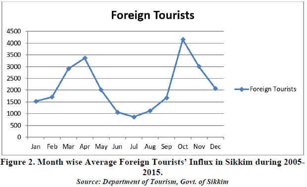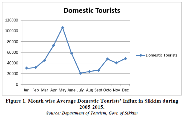 The following figure (Figure 1) depicts month wise domestic tourist arrivals in Sikkim during the period of 2005-2015. It reveals the spread of domestic tourist inflow are not evenly distributed, instead, remained concentrated to select few months during the course of eleven years. Month of May preferred by domestic visitors to the state as it recorded maximum tourist inflow followed by April, June, October etc. in descending order. May, April and June together account for 43.4 per cent of the domestic visitors of the state; while months of July, August and September, being the rainy season, considered as lean period for the same as it recorded 13.11 per cent share of visitors during the period.