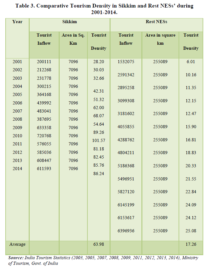 Tourism density measures tourist arrivals in relation to per square kilo meter area of a destination. Point to point analysis of Table 3 suggests that average tourism density in Sikkim was 3.71 times of the same in rest NESs during 2001-14. The state hosted tourist influx of 101.57 tourist density indicates its highest influx of 102 tourists per square km during 2010. As the state’s population density is 86 people per square kilo meter as per 2011 census, floating population of 102 tourists creates extra pressure on land and masses of the destination. A sharp fall of tourist arrivals and its density in the subsequent year largely attributable to earth quakes surfaced in Sikkim during 2011. Strikingly, domestic tourists’ (Table 2) visiting the state have dwindled during 2011-14 but foreign tourist arrivals’ have gone up by 2.08 times in the same period.