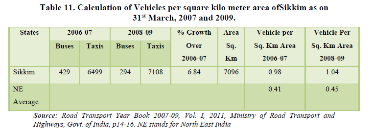 Sikkim recorded 0.98 and 1.04 vehicle per square kilo metre during the period of 2006-07 and 2008-09, which is higher than North East average for the same. During 2009-10, Sikkim has registered 880 contract/stage carriers and 41 luxury tourist vehicles to facilitate traffic volume in the State (GoS, 2012). Hence, it, thus, enhances vehicle per square kilo metre area to 1.17 till 2009-10.