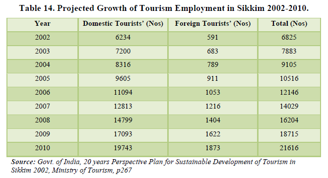 The Table 14 shows projected growth of direct tourism employment in the State for 2002-2010. Perspective plan suggeststhat 15 per cent annual addition to the tourism employment with spurt in tourist arrivals’ in the state. The domestic tourists, being largest segment, created more employment opportunities than the foreign tourists during 2002-2010. The total employment calculated as 21616 persons in 2010. However, it does not include the induced employment generated from tourism.