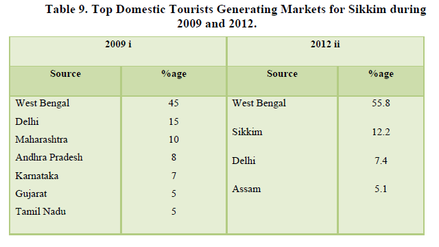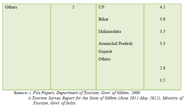 Domestic tourist influx in Sikkim is primarily dependent on neighboring state West Bengal as it recorded 45 and 55.8 per cent of the total domestic tourist arrivals in the state during 2009 and 2012 (Table 9). Ironically, the number of rests of the states of origin visitorsin 2009 have gone down in percentage terms during 2012.