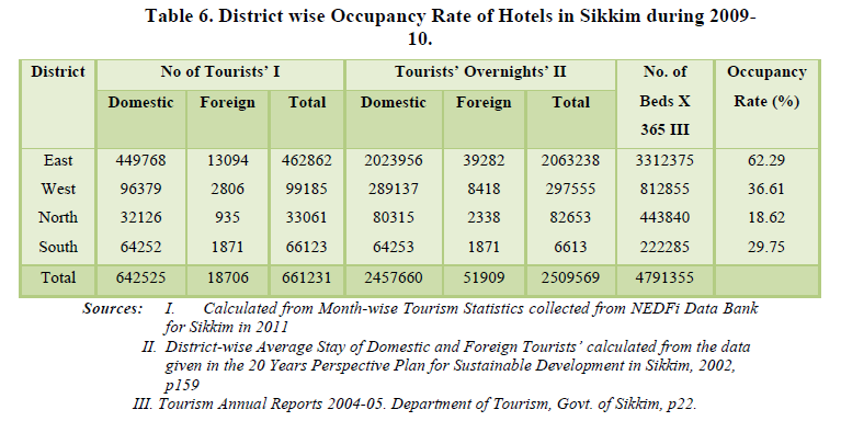 Table 6 illustrates district wise occupancy rate of hotels in Sikkim during the year 2009-10. The ORindex for East District was 62.29 per cent; the highest among all districts in Sikkim. The same for West District and South District stands at 36.61 and 29.75 per cent respectively. The North District has registered the lowest OR index during 2009-10.