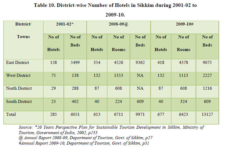 Accommodation sector comprises number of hotels, beds and rooms available to tourists. East district records (Table 10) the largest share of number of hotels, rooms and beds during the period of 2001-02 to 2009-10. This follows West, North and South districts in descending order.