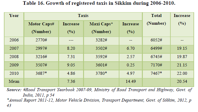 Table 16 depicts the growth of registered taxis in Sikkim during 2006-10. The taxis comprised of motor caps and maxi caps registered gradual positive increase during the course of five years. The overall growth of taxis was 19.15 per cent in 2006 gone up to 22 per cent in 2010, recording 23.38 per cent increase in 2010 over the number of caps in 2006.
