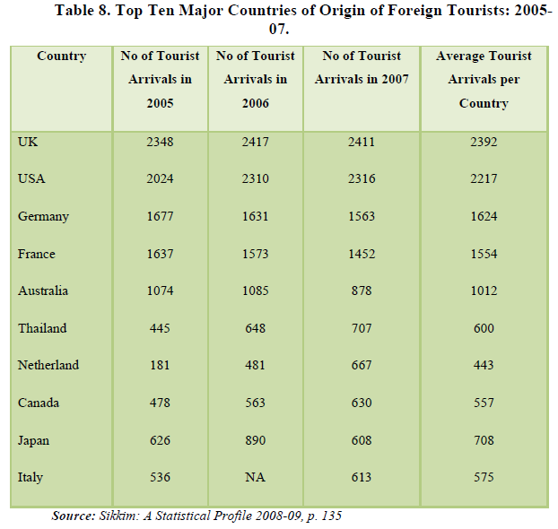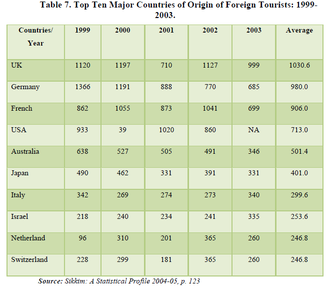 The major ‘countries of origin’ of foreign tourists (Table 7) suggests dominance of select European countries which boast of 80 per cent of the total foreign tourist arrivals (FTAs) during 1999-2003. The UK, Germany and France together constitute 52.28 per cent of the total FTAs in Sikkim during the period. Representations of FTAs from other continents, with the exception of USA, are negligible during 1999-03.