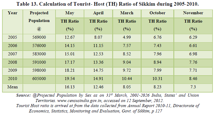 The tourist host (TH) ratio of Sikkim during the period of 2005-2010 for five peak months’ representing about 60 per cent of total tourist influx in the State during the period. With exception of October and November, 2009, every successive period registered higher rate of growth of TH ratio during 2005-10. The TH ratio is highest for the month of May throughout the period followed by April, October, March and November in descending order. The overall TH ratio for these five months was 10.43 per cent which are measured to be quite high considering the fragility of the landscape and its impact upon related infrastructure.