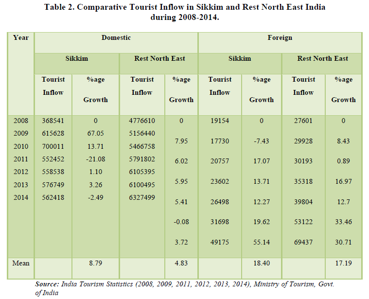 The growth of tourist inflows in Sikkimis examined through the following table narrating comparative tourist influx in Sikkim and rest of North East during 2008-2014. Table 2 illustrates proportional domestic and foreign tourist arrivals’ in Sikkim and the rest seven North Eastern States’ (NESs) during 2008-14. The tiny hilly NES, Sikkim registered higher mean growth rates on both counts than the rest NESs by 3.96 per cent and 1.21 per cent respectively during seven years. Domestic tourist arrivals’ in Sikkim, accounts for 95/96 per cent of the total arrivals, indicating fluctuating pattern of growth compared to international arrivals during 2008-14.