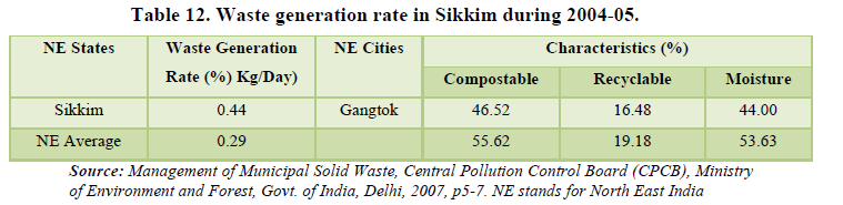 Sikkim generates 0.45 per capita of solid waste per day amounts to 8.75 kgs per square kilo meter area of the State. The total quantity of municipal solid waste generated is about 42 tonnes per day (0.27 per cent) and the problem is mainly in urban areas (GoI, 2008). Table 12 reveals the quantum of municipal solid waste generation per cent per kg per day in Gangtok (i.e. 0.44) is higher than the North East average during 2004-05. The actual figure might be quite higher than whatever mentioned above. A compost plant at Martam is designed to handle waste amounting to 50 metric tonne per day which covers entire organic waste generated at Gangtok and the neighboring areas. However, the landfill area which is designed to for 15 to 20 years may not last that long. Hence, the principle of 3R and waste segregation are mandatory for effective treatment of waste in the city (GoS, 2007).