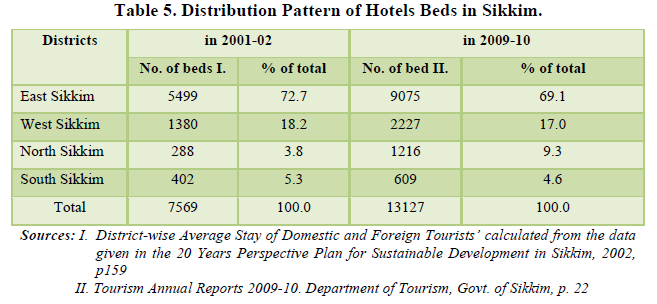 The Table 5 shows distribution pattern of hotel beds in Sikkim during 2001-02 to 2009-10. Of the total available hotel beds in Sikkim, East District holds 72.7 per cent of those during 2001-02 followed by West District (18.2 per cent), South District (5.3 per cent) and North District (3.8 per cent) respectively in descending order. In the next phase 2009-10, East District retained its top position (69.1 per cent) in terms of its share in total available hotel beds in followed by West (17.0 per cent), North (9.3 per cent) and South (4.6 per cent) in that order. It can be observed East and West Districts together accounted for around 90 per cent of the total hotel beds in the state suggesting tourist concentration pattern in the state.