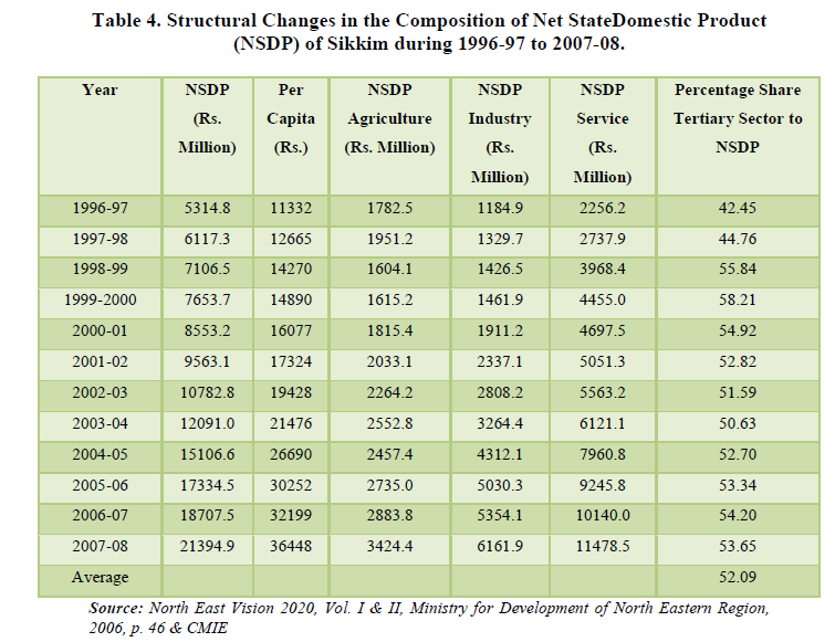 Structural changes in the state NSDP (Table 4) during 1996-97 to 2007-08 reveal overwhelming dominance of service sector in terms of its contribution to state economy. Service sector comprises of accommodation, banking, insurance, tourism etc. among others. The average share of this sector to Sikkim’s economy pegged at 52.09 per cent during the period of twelve years.