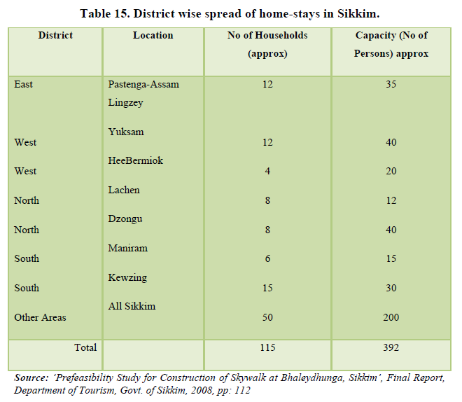As a part of promoting community-based tourism, home stays are developed across Sikkim through local initiatives. Table 15 shows district wise growth of home stays throughout the state till 2008. These home stays provide revenues rural populace in the one hand and also facilitates dispersal of tourists’ from already congested urban centres on the other. Altogether, 115 home stays were in operation till 2008, of which only 12 of them were situated in congested East District. The rest were distributed in the three districts of Sikkim.
