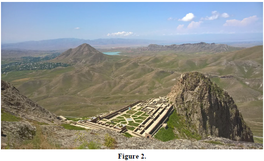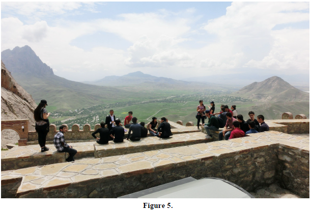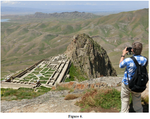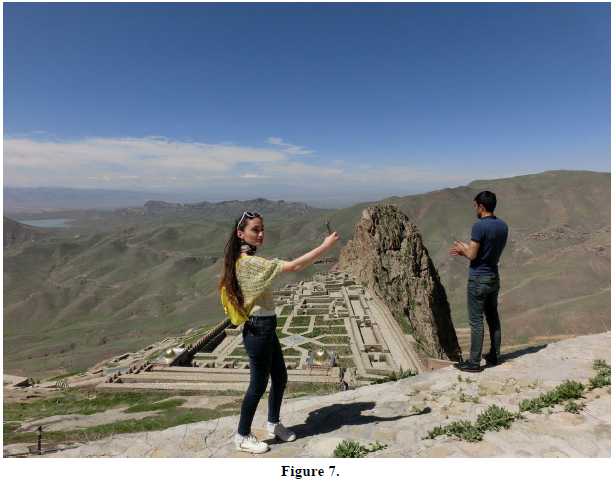 It is fact that the practical possibility of the Roof tourism in the Alinja Castle is very high. As it was mentioned above this castle is at 30 km. distance from the international airport in the city of Nakhchivan. Transport usage to the castle is very easier, comfortable and multitranche as well. So that, there are 4-6 plane flights from Baku the capital of Azerbaijan, once a week plane flights from Moscow and Istanbul and together with this one can visit here via Igdir (the border province of Turkey with Nakhchivan)-Nakhchivan customs working 24 h by any automobile which only takes 3 h to arrive at the destination. One glad news to convey to the mind of tourists is that including road to Alinja Castle, all ways and roads in the territory of Nakhchivan Autonomous Republic have been completely reconstructed, modernized and safety is of high quality (Figure 4). No one can complain about traffic jam and no one can feel any minute program delay in transportation. Trade services along the ways are highly hygienic and meet to standards. The opportunity to stay in the 4-5 star hotels and make a reservation is very simple and easy. It is possible to visit the Alinja Castle by taxi from Nakhchivan which costs about 40 Manats (20 Euros). All tourism agencies and tourism operators acting in Nakhchivan have got young guides and polyglots too. Also the regional tourism and information center operating in Nakhchivan can any time offer their help to tourists. In the direction of Alinja Castle and totally in Nakhchivan local people are very kind and sensitive to the tourists. Visitors being in Nakhchivan and its suburbs surprise with unthinkable sanitary cleanness and even the Alinja Castle, respectively. One can easily use drinkable water from any spring and taps in the settlements without any fear, since the safety of drinkable water is guaranteed. Poisonable insects are seldom seen in the castle and around it. Climbing up the Alinja Castle due to age, gender and group members of the tourists change between 2-6 h. Even especially in hot and warm months of the year evening tours are possible to the Alinja Castle, since the constant evening illumination there. Though upstairs to the Alinja Castle enough number of litter containers have been placed but the tourists being there use of them very seldom, as they don’t take with themselves food or fruit to eat but only bottles of water or energetic biscuit packages. Again around the castle seems to us as mighty as it was thousand years before. All birdwatchers prefer to observe the fly of eagles and other rare birds over their heads from the top of the mountain. As the top surface of the castle is large enough (about 2 hectares) it is possible to place about 600 people at once there. In most cases selfie mad tourists enjoy taking various selfies on the highest rocky peak but Muslim tourists prefer to perform their praise on the castle more heartily. As due to Islamic belief to pray on the high point means to be closer to God. Especially in the afternoon pray time the sounded Azan from the village mosques at 3-6 km distance (Figure 5) makes very charming recreation in the mind of non-muslim tourists, it seems to them as miracles. The effect of mentioned factors ispermanent as besides the bird sounds and wind blow there is nothing to spoil theharmony of nature. There is very vast and huge panorama (Figure 6) starting fromthe territory of Iran till the Zangazur Mountains for those who enjoy taking photosor selfie (Figure 7). The shape and structure of the Alinja Castle cause to feel theleast highness fobby on people. The recommended age for the castle climbers isbetween 8-80. Among the local people there is no any complainer connected withthe climbers to the castle as the tourists don’t commit any problem or discomfortagainst their daily routine. Tourists climbing up the mountain can use of differenthelps of the existing sanitary station. In the same time the tourists arerecommended to make use of umbrellas and sun creams in the hot months. In anycase the experienced tourists visiting long distance place as Machu Picchu or theAlinja Castle clearly know what to have about themselves, what to take with themselves. At last after seeing the wonders of the Alinja castle and taking some notes for themselves they get additional opportunity to see the found objects after restoration in the built museum at the foot of the castle and learn rich information on the ancient history of the Azerbaijani people.