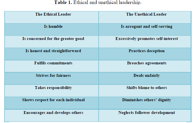 In addition, ethical leadership is said to be the use of power and authority by position and law, but still emphasizes the characteristics of values, norms, attitudes, beliefs, procedures and behaviors consistent with the requirements of institutions (Mihelic, Lipicnik & Tekavcic, 2010). This as an acknowledgment of moral leadership remains intimately associated with social institutions and institutions. Katarina (2010) listed some of the ethical and unethical leaders’ behaviors shown in the table below.