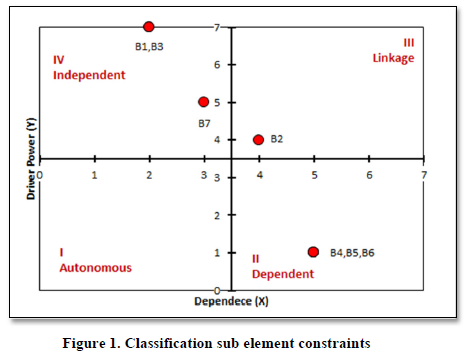 Are key sub-elements with the highest driver powers to push other elements and lowest dependence to other sub-elements? In addition, the second highest driver powers (5) was B7 the second lowest dependence (3) was also B7 which mean that sub-element (infrastructure that does not support) is the second key sub-elements which has strong driver power to push other sub-elements and has low dependence to other sub-elements.