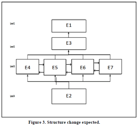 However, the lowest driver powers (1) were E1. The highest dependence (7) was also E1 which mean that sub-element (improvement of small medium enterprise) have the lowest driver power and have the highest dependence to other sub-elements. Therefore, all sub element support E. Lastly, other sub-elements E3 become linkage sub-elements which link each other and with key sub-elements in order to support E. The structural diagram of sub-elements of program expected change can be seen in Figure 3.