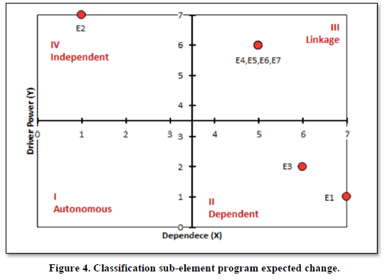 The results show that the highest driver powers (7) E2. The lowest dependence (1) was also E2 which mean that sub-element (increase human resource capacity) is key sub-element with the highest driver powers to push other elements and lowest dependence to other sub-elements. In addition, the second highest driver powers (6) were E4, E5, E6 and E7. The second lowest dependence(5) were also E4, E5, E6 and E7 which mean that sub-elements (improvement of supporting elements, optimization of land use, improvement of infrastructure, improvement of technology) are the second key sub-elements which has strong driver power to push other sub-elements and has low dependence to other sub-elements (Figure 4).