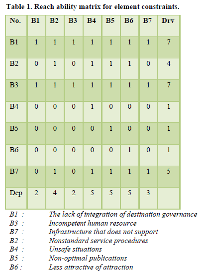 Figure 3 shows the lack of integration of destination governance (B1) and incompetent HR (B3) is the main obstacle. Infrastructure that does not support (B7) is then extobstacle that causes nonstandard service procedures (B2). In addition, it causes unsafe situations (B4), non-optimal publications (B5) and less attractive of attraction (B6) which are constraints that influence each other.
