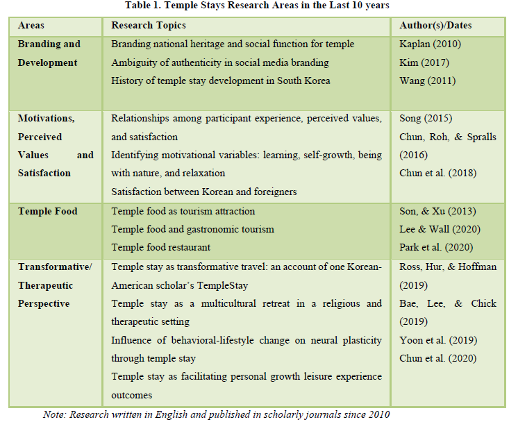 It is surprising to discover that nearly two decades after the inception of temple stays, academic analysis of this niche tourism segment has received relatively little scholarly attention. We categorize the literature into four topic areas that include (a) branding & development, (b) motivation, perceived value, and satisfaction, (c) temple food and, (d) transformative/therapeutic Table 1. Earlier publications focused on the history and development of temple stays (Kaplan, 2010; Wang, 2011). As temple stay travel has increased, scholars have investigated patrons’ motivations, perceived values, foreign and domestic satisfaction, and culinary experiences (Chun, Roh, & Spralls, 2016; Chun, Roh, Spralls, & Kim, 2018; Lee & Wall, 2020; Park, Bonn, & Cho, 2020; Son & Xu, 2013; Song, 2015).