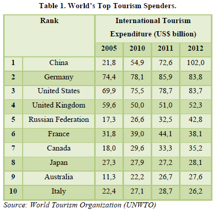Expenditures by Chinese travellers are exponentially increasing. Between 2000 and 2012, expenditure abroad of Chinese tourists was multiplied by eight, as the number of international travel, which increased from 10 million to 83 million over the past twelve years. The purchasing power of Chinese tourists is also higher than that of Americans (Table 1).