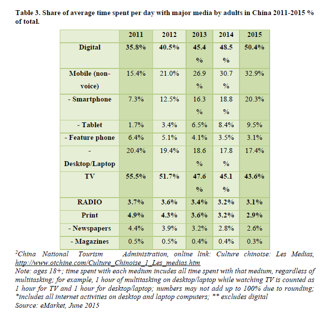 In China, Traditional media are rapidly losing ground to online media. This year 2015, 50.4% Chinese adults have spent half of their time per day on online media, against 48.5% in 2014.