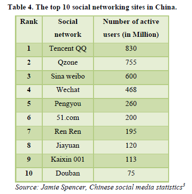 China’s government exerts control over every significant business in the country. Companies in China must be majority owned by a Chinese citizen and even then are heavily regulated by the government. All the major corporations in China, including telecommunications and media companies, are state owned entities or are majority owned by the state. Because China’s government has instituted a strict system of controls over Internet usage in the country and has blocked access to many Western social media websites via the Great Firewall of China, it is also one of the most unique social media markets (Table 4). This exerts a significant level of state influence on how people receive and send information.