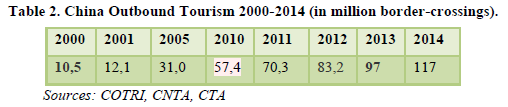 According to China, as a fast-growing developing country in Asia, is gaining importance in the international tourism market. Its population starts travelling overseas. In 2014, China outbound tourists reached 117 million, an increase of 19.16% over 2013. Chinese visitors made great contributions to the development of outbound destinations in many aspects during the year, including hotels, restaurants, attractions, airlines and retail.