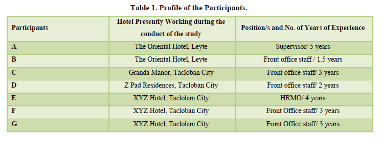 The participants were informed in advance about the study and they were briefed on its objective and the result that it would like to achieve. They were made to understand that the study would highlight their experiences as workers in hotels and eventually their actual experiences in dealing with their customers particularly the problems in satisfying their daily guests would be solicited from them. The researchers made it sure first that the participants are willing to share and would be open in laying down their personal and actual experiences and encounter with guests in their respective establishments (Table 1).