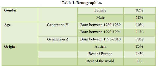Due to the limited resources and reach of the questionnaire, the study was heavily Austrian orientated (85%). Furthermore, 14% stated to have their origin in another European country. As Instagram is an internationally spread online application, it would be highly beneficial for further research to conduct a similar study in different countries in order to make different nationalities comparable. Continuing with the demographics of the conducted online survey, a limitation regarding the age distribution had to be dealt with as only 21% of the participants represent Generation Y and therefore the generational comparisons that have been conducted may be seen as inconclusive. However, it has been tried to compare the percentual proportion within the generational cohort.