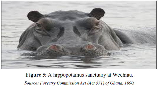 The Upper West Region makes up 3% of the total land mass of Ghana. Popular tourist sites in UWR include the Wechiau hippopotamus sanctuary (Figure 5). Gbollu slave defense wall, the George Ferguson’s tomb in Wa and Gbelle game reserve. Wechiau is a home to most of the country’s hippos. There is nowhere else in the country to find more of these hippos which can be well spotted closely on canoe rides along the river. Around the hippo sanctuary it is very common to spot chameleons, monitor lizards, hedgehogs, snakes and many other animals. There are up to 200 different bird species nesting within this hippo sanctuary enclave. This reserve mainly serves as a home to many endangered animals. Wild animals in Wechiau sanctuary are conserved for natural reproduction, to populate and keep them alive for sustainability functions. The most valued and protected animal species in the sanctuary comprise of hippos, water bucks and some endangered bird species (IUCN 2010, Kuuder et al., 2013).